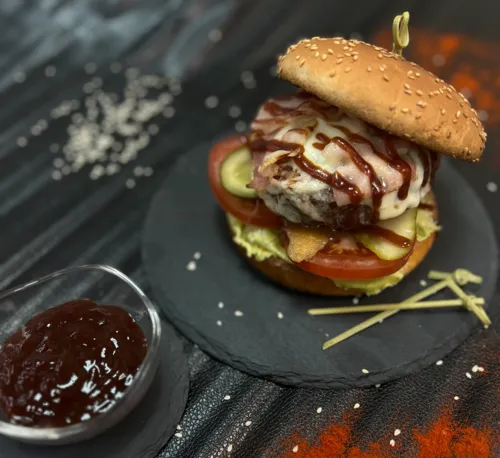 Гамбургер представляет собой классическое блюдо, состоящее из двух мягких булочек, между которыми размещается сочная говяжья котлета, приготовленная на гриле. В качестве дополнительных ингредиентов используются свежие овощи, такие как салат, помидоры и огурцы, а также ароматный сыр и специальный соус, который придает блюду уникальный вкус. Каждый гамбургер изготавливается из высококачественных продуктов, что обеспечивает его превосходный вкус и питательную ценность. Также возможны варианты с заменой мяса на курицу или вегетарианские альтернативы. Идеально подходит для быстрого перекуса, а также для полноценного обеда или ужина. Гамбургер можно дополнить картофелем фри или напитком, создавая тем самым сбалансированный комплексный прием пищи.