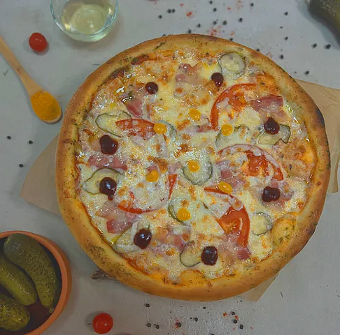 пицца с беконом,томатом и мариннованым огурчиком