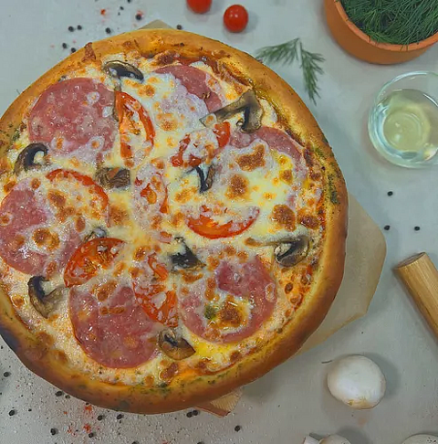 Пицца "Ветчина и грибы" представляет собой идеальное сочетание нежного теста, тонко расправленного и запеченного до золотистой корочки, и ароматного томатного соуса, который служит основой для этого кулинарного шедевра. В качестве начинки используются высококачественная ветчина, нарезанная тонкими ломтиками, и свежие грибы, что придаёт блюду уникальный вкус и насыщенный аромат. Пицца щедро посыпана сыром моцарелла, который плавится до идеального состояния, создавая аппетитную тягучесть. Каждый кусочек наполнен гармонией вкусов и идеально подходит как для обеденного, так и для вечернего застолья. Предлагается в различных размерах, что позволяет выбрать оптимальный вариант для любого количества гостей. Данная пицца станет отличным выбором для ценителей итальянской кухни и тех, кто ищет что-то особенное для своего стола.