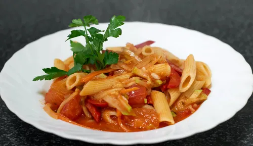 Паста пене в томатном соусе с овощами