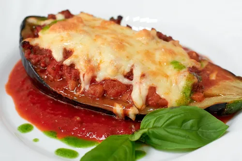 Запеченный баклажан с мясом под сыром представляет собой изысканное блюдо, сочетая в себе богатый вкус запеченного овоща и насыщенную мясную начинку. Баклажаны обжариваются до золотистой корочки, что придаёт им особую нежность и аромат. В качестве начинки используется высококачественное мясо, маринованное с добавлением свежих трав и специй, что обеспечивает насыщенный вкус и сочность. Блюдо запекается под слоем плавленого сыра, который образует аппетитную корочку и усиливает гармонию всех ингредиентов. Это идеальный вариант для семейного ужина или праздничного стола, который порадует как любителей овощей, так и мясных деликатесов. Подавать блюдо рекомендуется горячим, что позволит насладиться его полным вкусом и ароматом.