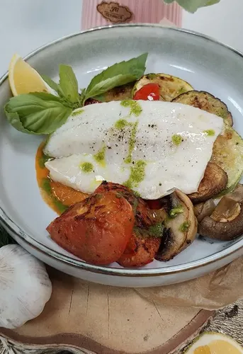 Судак с овощами гриль представляет собой изысканное блюдо, в котором свежая рыба высокого качества подается вместе с тщательно отобранными сезонными овощами, приготовленными на гриле. Филе судака обладает нежной текстурой и насыщенным вкусом, что делает его идеальной основой для этого гастрономического шедевра. Овощи, такие как цукини, болгарский перец и баклажаны, придают блюду яркие цвета и полезные питательные вещества, подчеркивая естественный вкус рыбы. Блюдо приправлено ароматными травами и легким оливковым маслом, что создает гармоничное сочетание вкусов. Судак с овощами гриль станет отличным выбором как для повседневного обеда, так и для праздничного стола, радуя гостей своим изысканным оформлением и насыщенным вкусом. Подается с легким соусом, который дополнительно акцентирует все богатство ингредиентов.